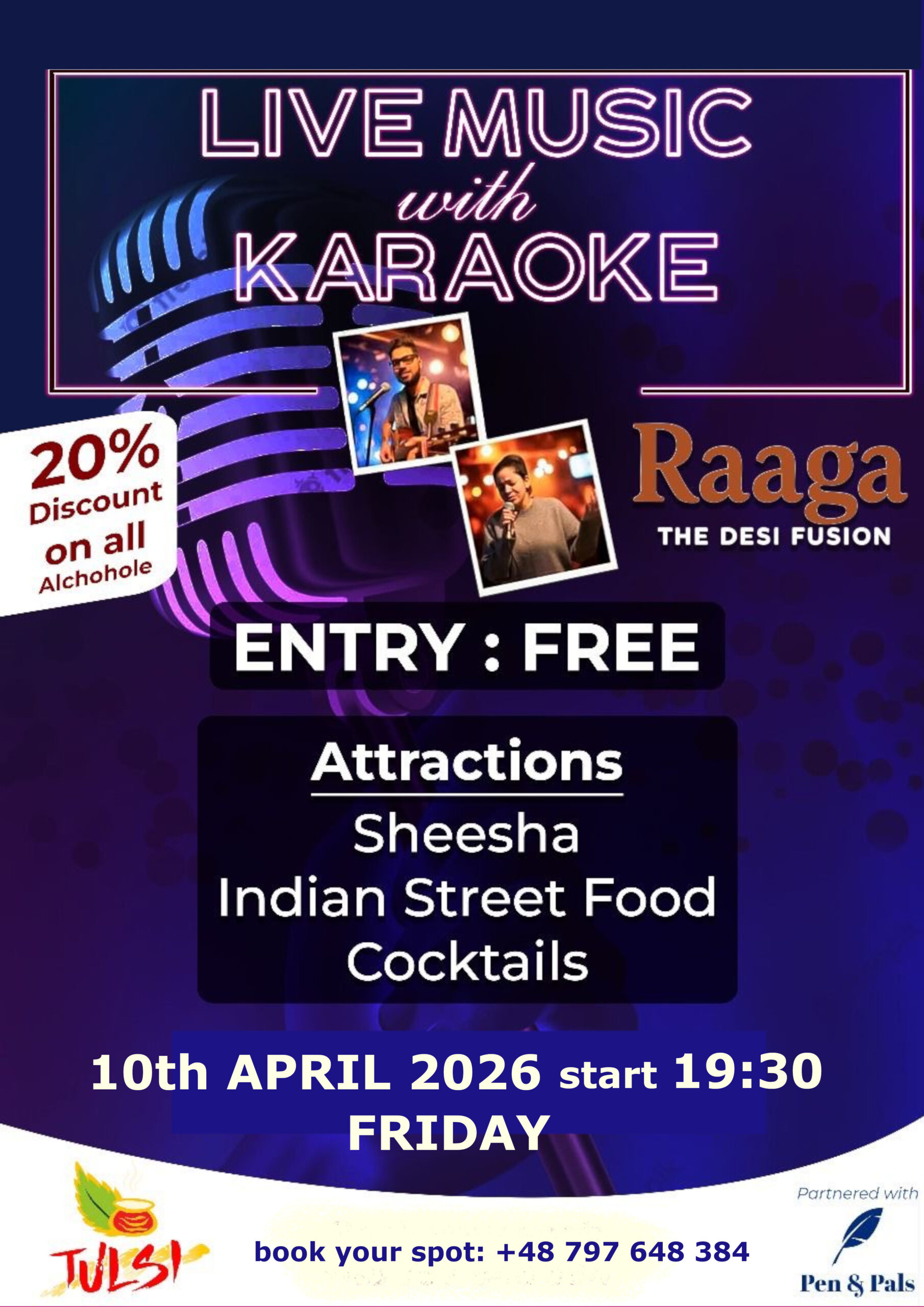 Live music with karaoke🎙️ 🎤 Raaga The Desi Fusion 🎙️ 🎤 FRIDAY 10th April 2026 start 19:30 with Pen & Pals Warsaw ! with Pen & Pals Warsaw !