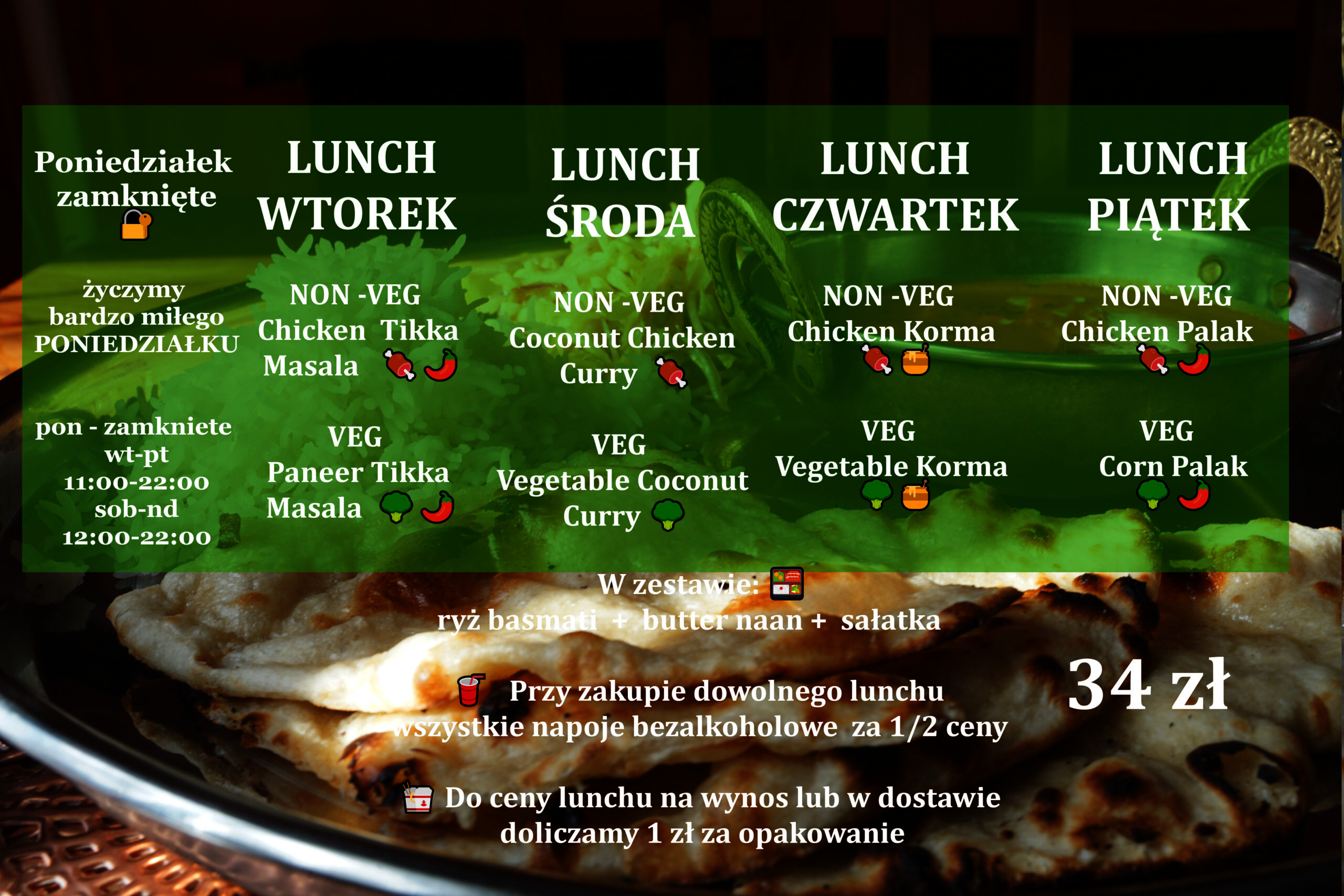 🥤 Przy zakupie dowolnego lunchu wszystkie napoje bezalkoholowe za 1/2 ceny