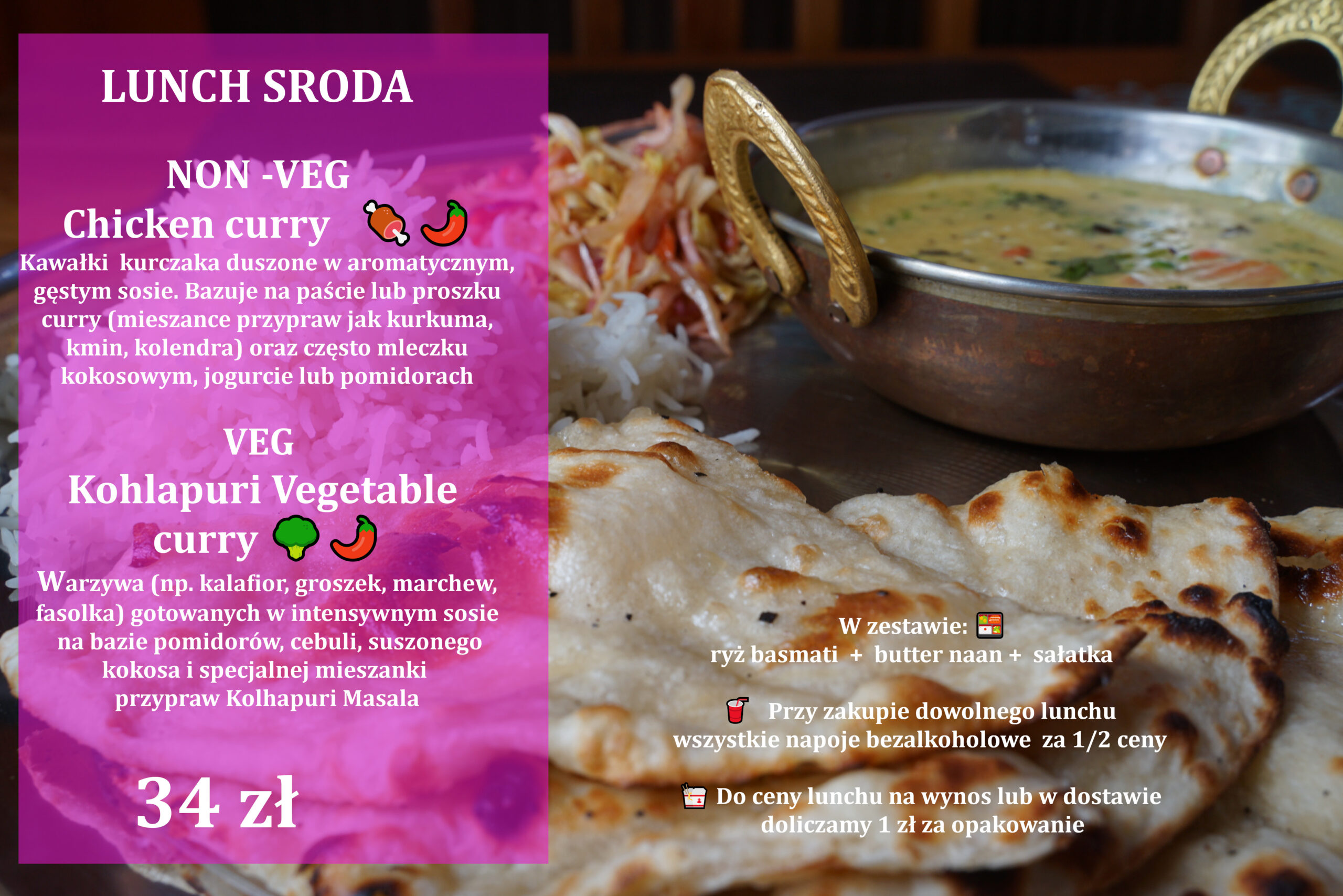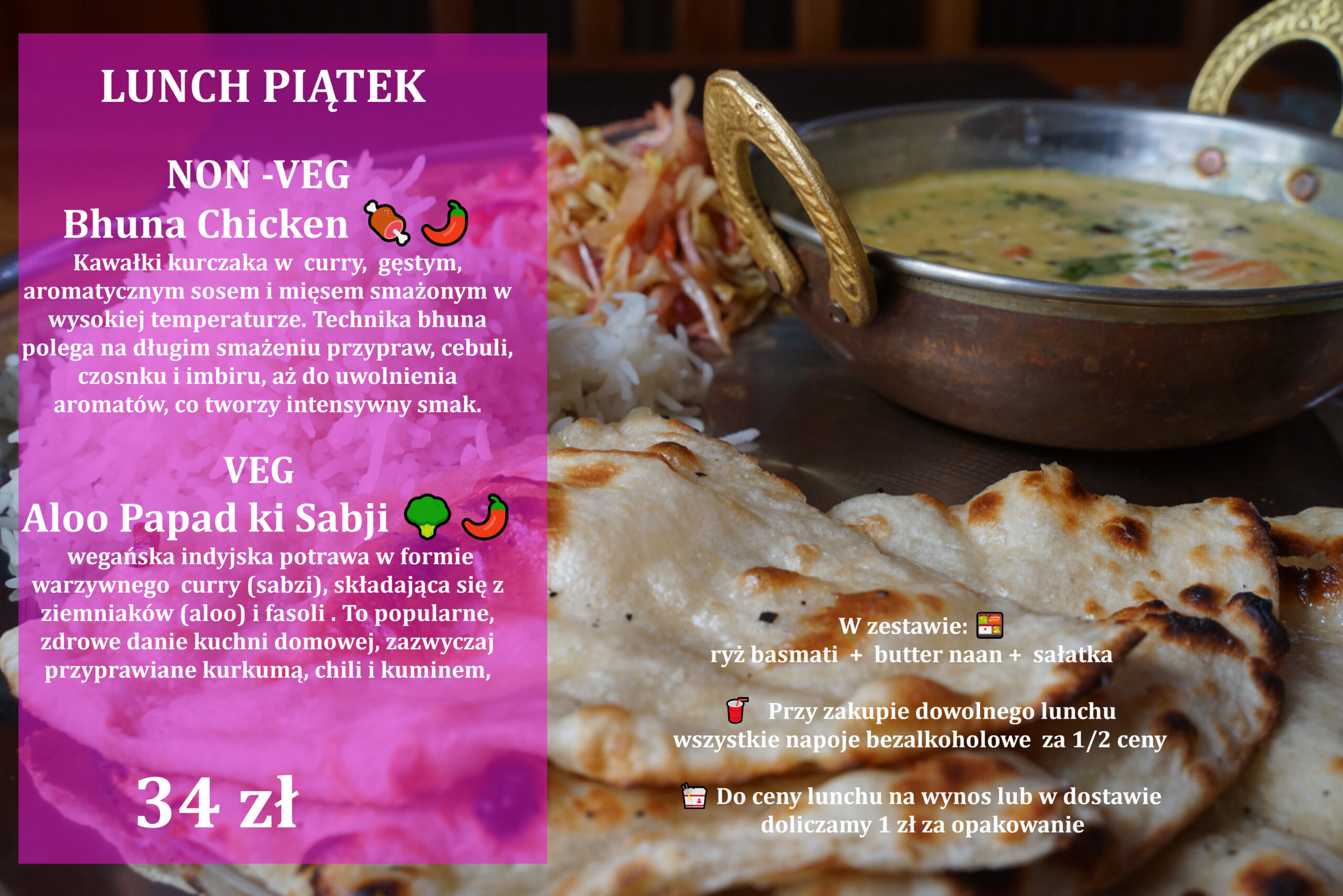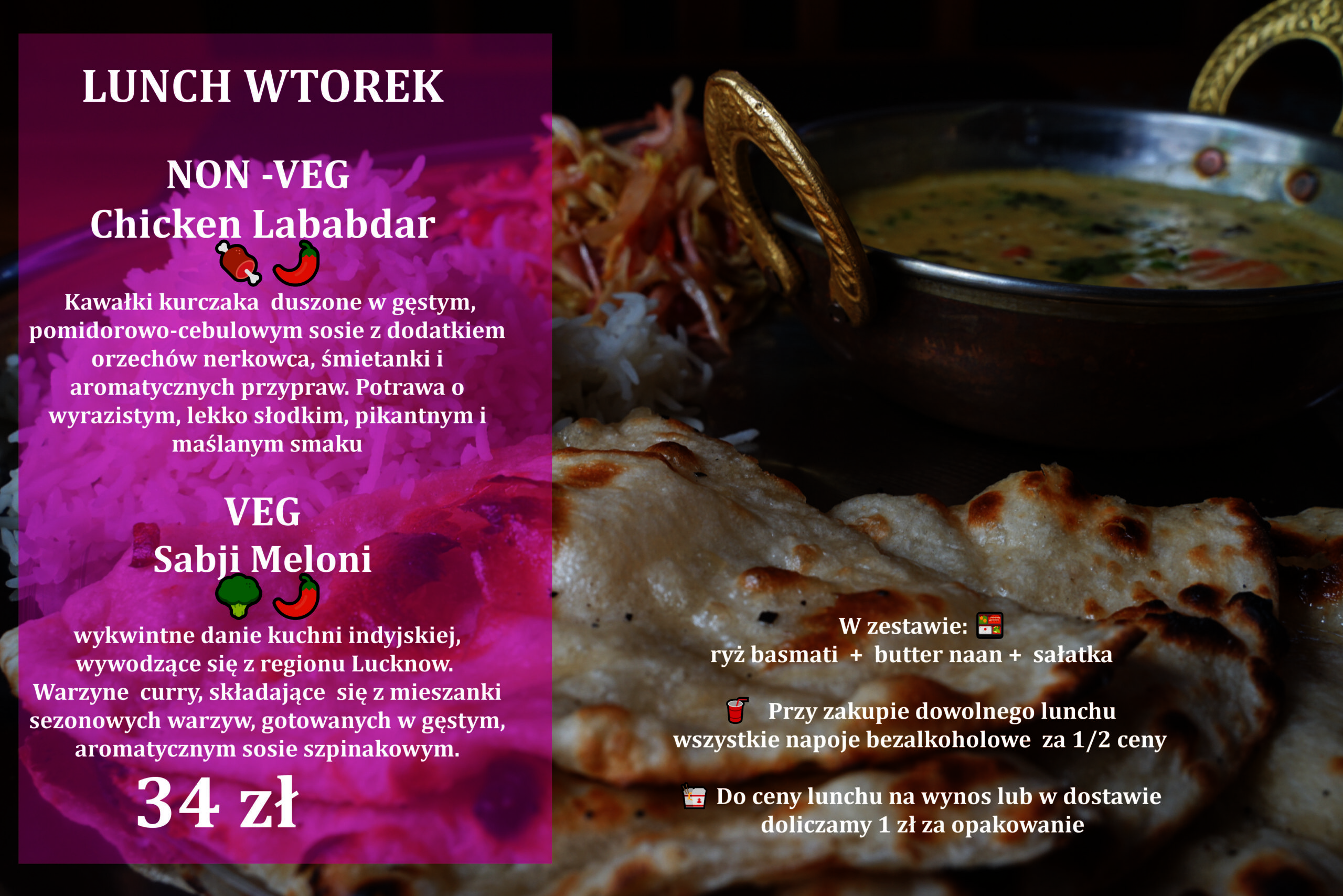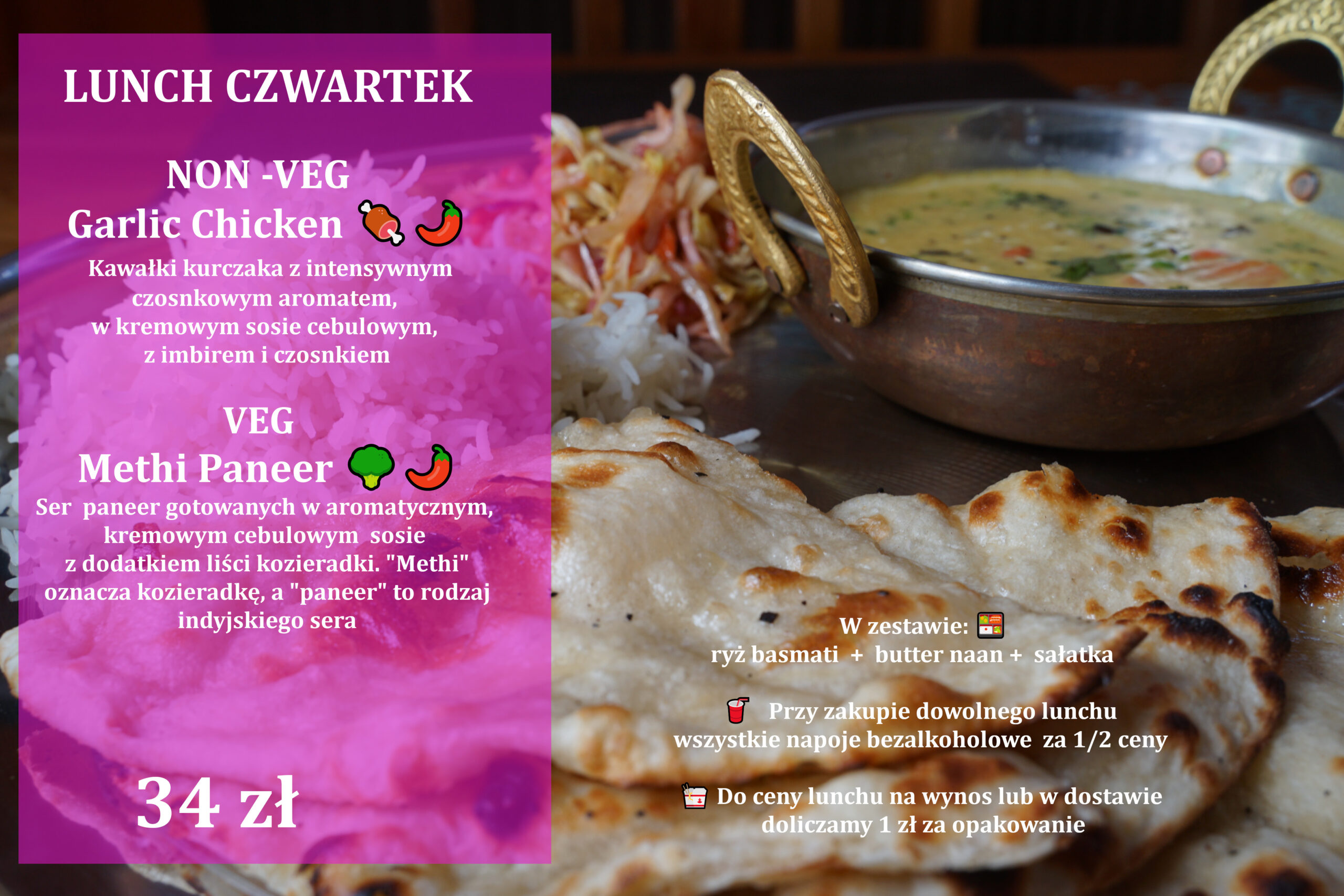 Każdego dnia jest inny zestaw lunchowy oraz wybór pomiędzy zestawami wegetariańskimi lub mięsnym. Nie ma możliwości wymiany dania głownego na inne niż to w ofercie lunchowej. Na lunch nie robimy też dań bardzo pikatnych.